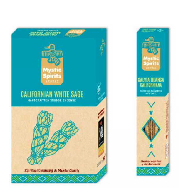 Mystic Spirits – Incienso Salvia Blanca Californiana, una fragancia sagrada y purificadora que limpia y protege, llenando tus espacios de luz, equilibrio y energía espiritual renovada.
