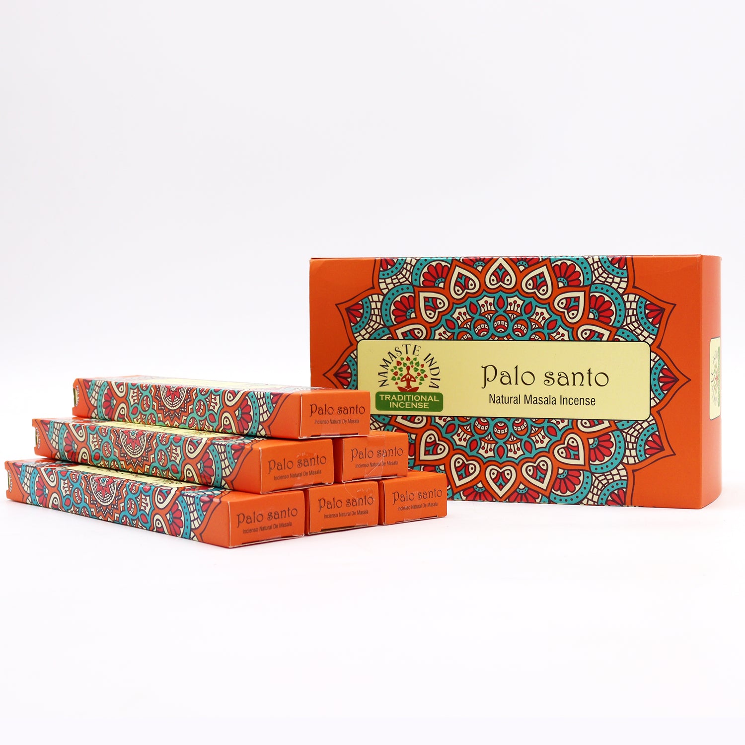 Namaste India – Incienso Palo Santo, una fragancia sagrada y equilibrante que limpia, protege y eleva la energía, llenando tus espacios de luz, armonía y bienestar espiritual.