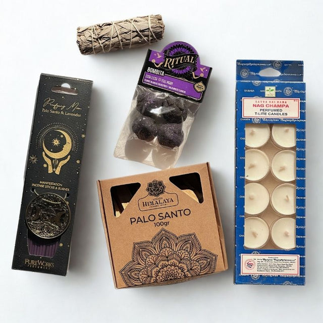 La luna llena es el momento perfecto para liberar lo que ya no sirve, agradecer y manifestar nuevos deseos. Este box reúne los elementos esenciales para guiarte en ese proceso: incienso para purificar, palo santo para elevar, salvia para proteger, vela para encender tu intención y bombas rituales para potenciar la energía.