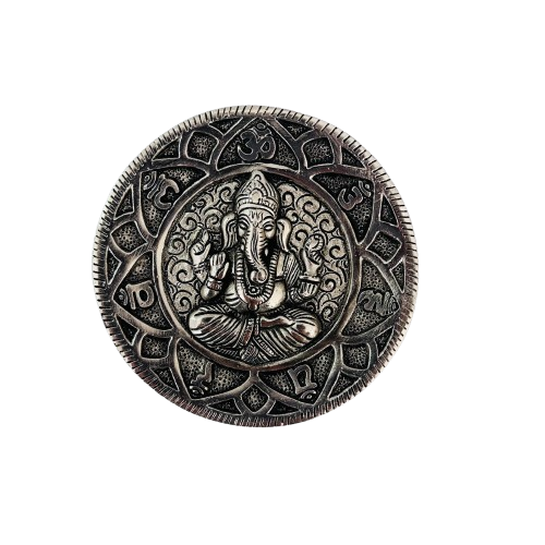 Su diseño redondo con relieve del dios Ganesha, guardián de los nuevos comienzos, aporta energía de protección, claridad y prosperidad.