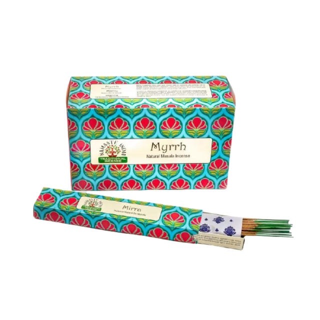 Namaste India – Incienso Mirra, una fragancia ancestral y purificadora que limpia, protege y eleva tus espacios, llenándolos de equilibrio, espiritualidad y energía divina.