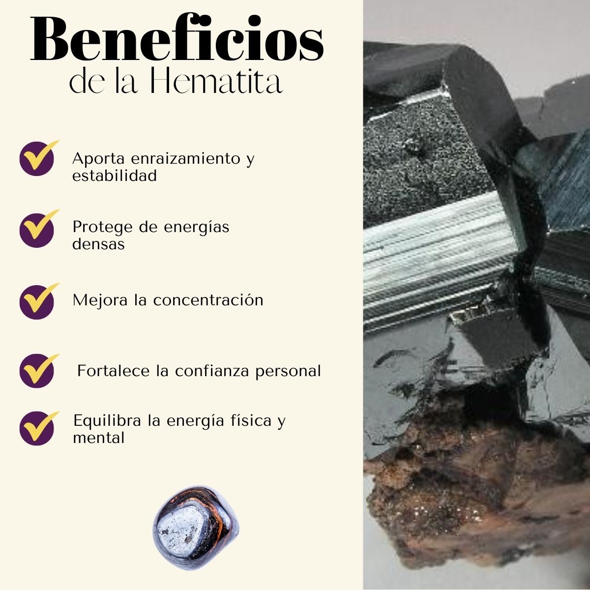 La hematita es conocida por su poderosa energía de conexión a tierra y protección. Ayuda a absorber energías densas, fortalecer la concentración y aportar claridad mental, siendo especialmente útil en momentos de estrés, dispersión o sobrecarga emocional. Se asocia al chakra raíz, favoreciendo la estabilidad emocional, la confianza y la sensación de control interno.