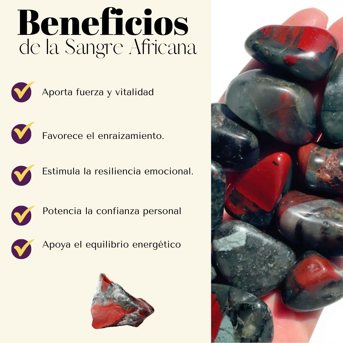 La piedra sangre africana es conocida por potenciar la energía vital, la determinación y la capacidad de afrontar desafíos con fortaleza y claridad. Tradicionalmente asociada a la protección energética y al coraje, ayuda a disipar el cansancio emocional, fortalecer la voluntad y mantener la mente enfocada, siendo ideal para procesos de cambio, toma de decisiones y momentos que requieren estabilidad interior.