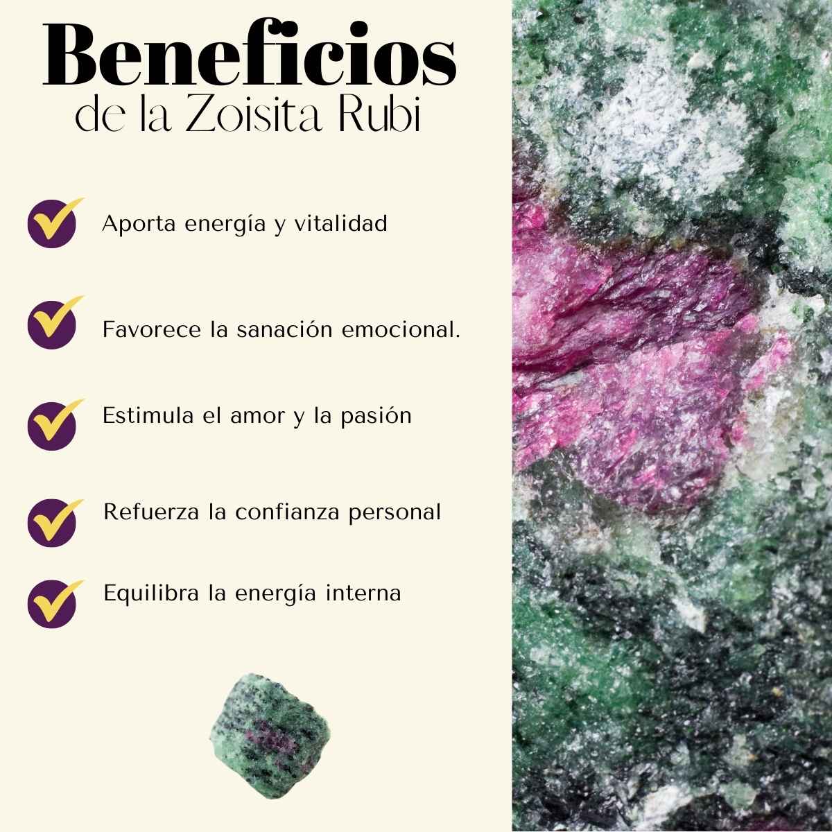 La zoisita rubí es conocida por unir la energía revitalizante del rubí con la capacidad de sanación y crecimiento de la zoisita. Favorece la regeneración emocional, la motivación y el entusiasmo por la vida, ayudando a transformar patrones negativos en impulso creativo y confianza personal. Se asocia al chakra corazón y al chakra raíz, promoviendo equilibrio entre emoción, vitalidad y acción.