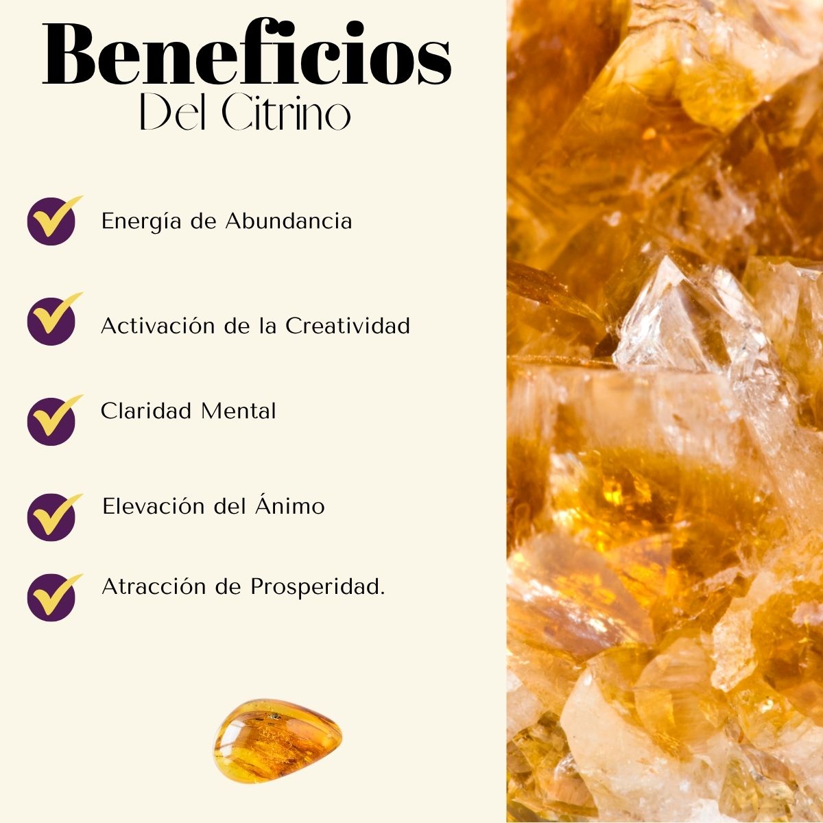 El citrino es conocido como la piedra de la prosperidad y la alegría. Ayuda a elevar el ánimo, atraer oportunidades, potenciar la confianza y disipar energías densas. Su vibración activa el plexo solar, fortaleciendo el poder personal, la claridad mental y la voluntad para manifestar metas y deseos.