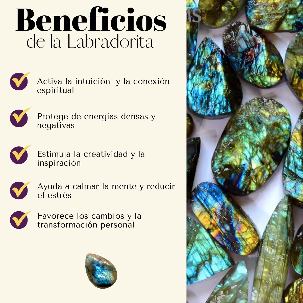La labradorita es reconocida como una piedra chamánica capaz de despertar la intuición, fortalecer el campo energético y disipar energías densas. Favorece la calma, la introspección y la claridad mental, ayudando a mantener el enfoque y la serenidad en momentos de transformación o crecimiento personal.