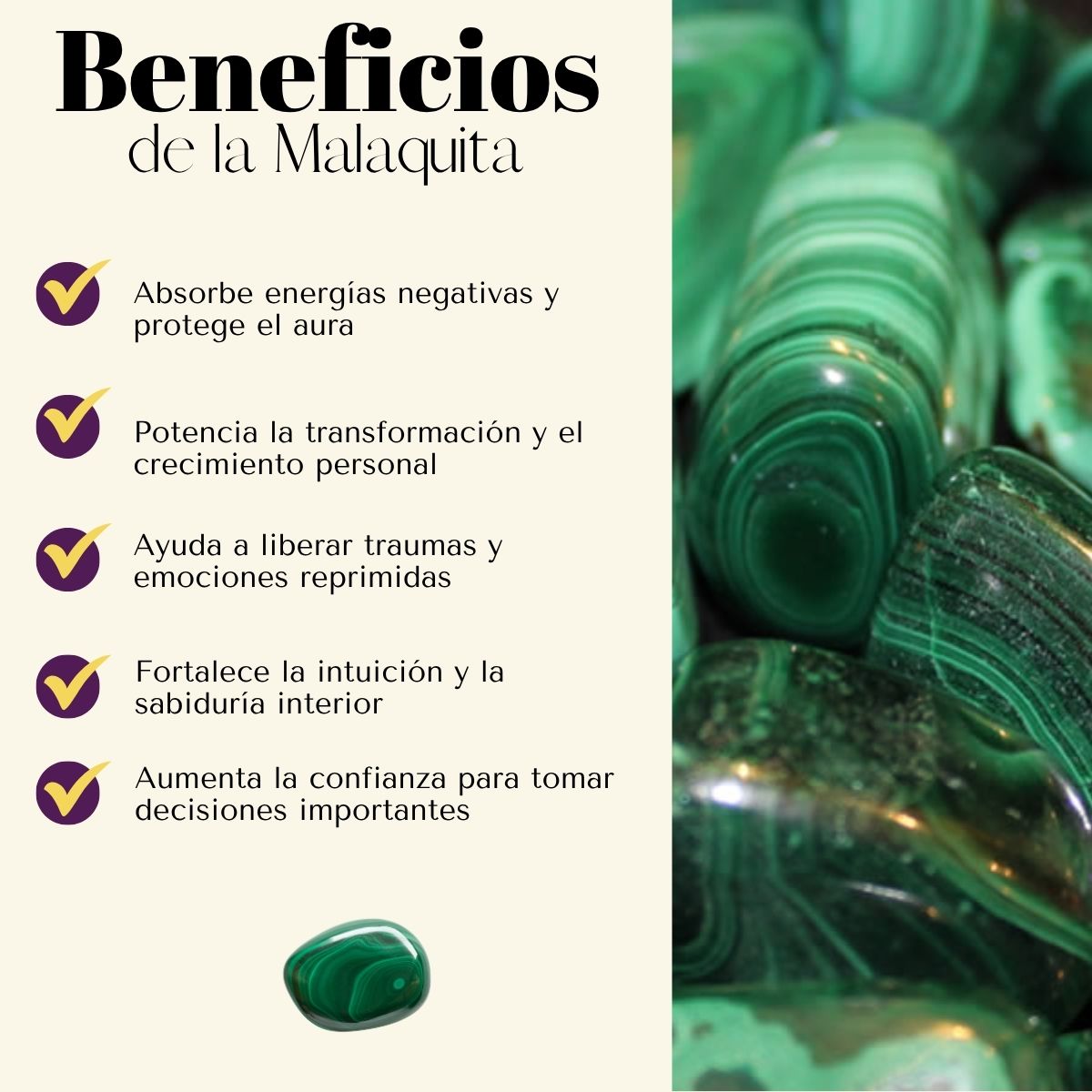 La malaquita es una piedra reconocida por su capacidad de absorber energías negativas y limpiar el campo áurico. Estimula la claridad emocional, potencia la intuición y facilita los procesos de cambio, guiando hacia la armonía y la expansión personal. Es ideal para quienes buscan evolución y fortaleza interior.