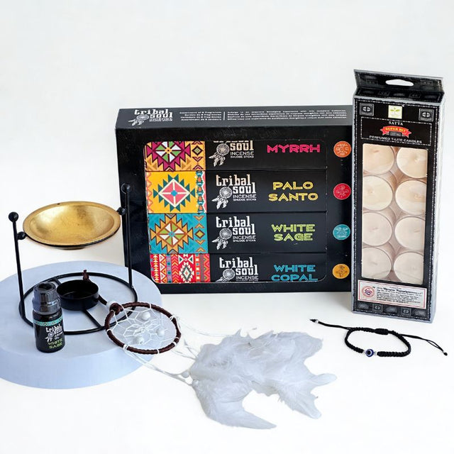 El concepto tribal conecta con lo ancestral, lo simbólico y lo esencial. La combinación de salvia blanca, inciensos rituales y elementos protectores trabaja la purificación profunda del espacio, la protección energética y la conexión interior, creando una atmósfera propicia para rituales, meditación y armonización del hogar.