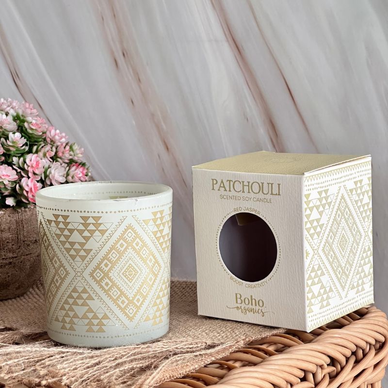 Vela Boho Pachulí con Piedra Jaspe Rojo, una fragancia intensa y enraizadora que combina la energía del jaspe rojo con el poder aromático del pachulí, llenando tus espacios de fuerza, serenidad y equilibrio interior.