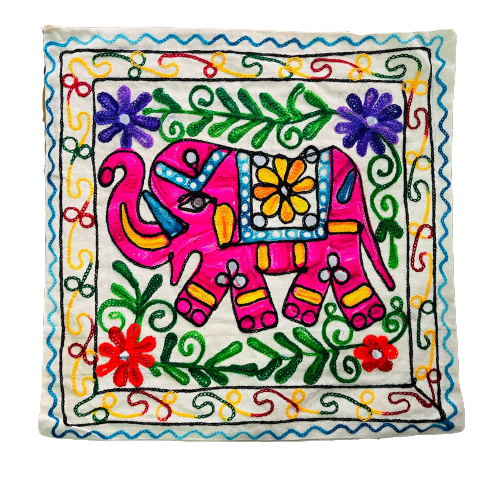 Elaborada en 100% algodón, presenta un delicado bordado a mano con la figura del elefante, símbolo de sabiduría, buena fortuna y protección, sobre una base que combina tonos rosados y verdes, evocando amor, equilibrio y frescura.