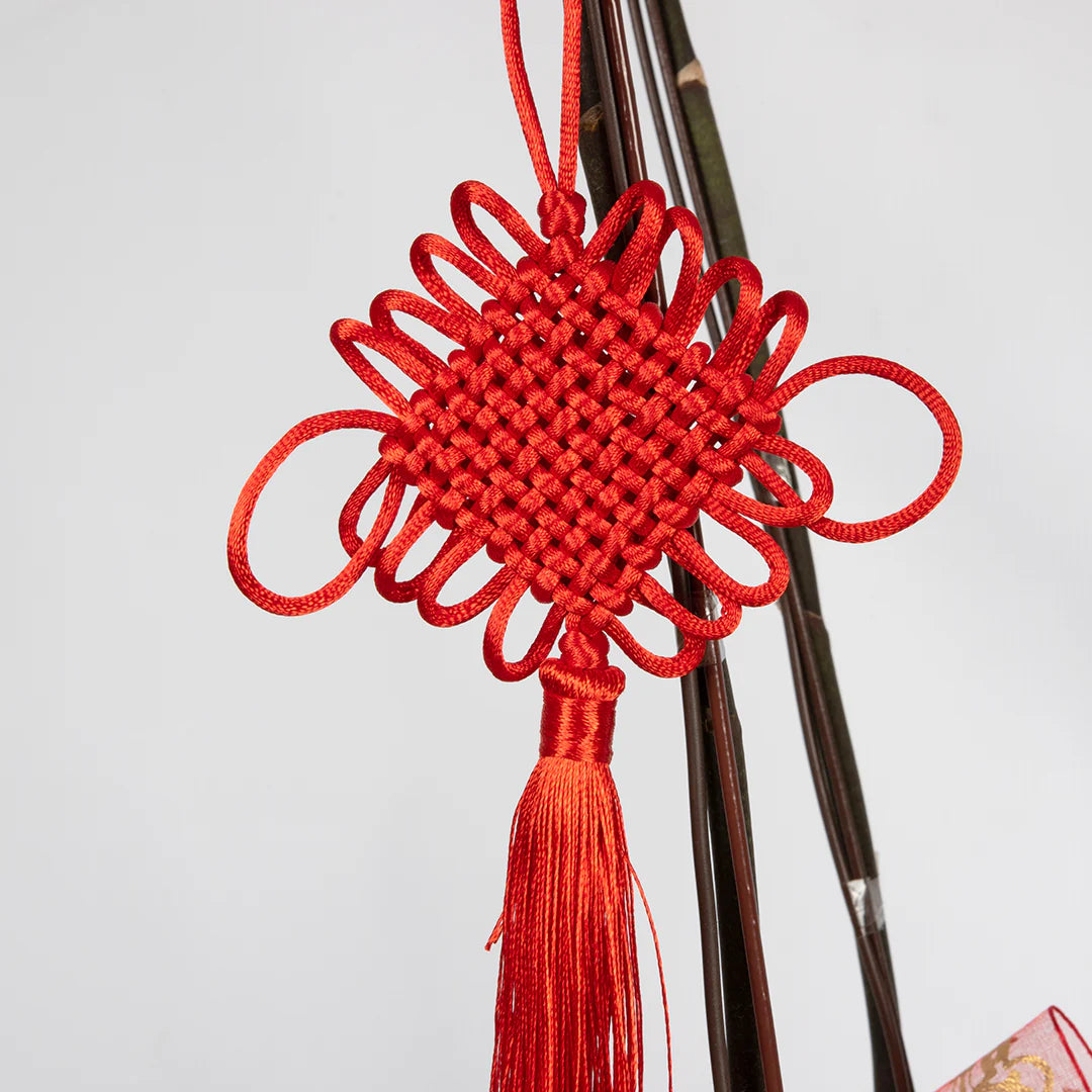 Su diseño intrincado sin principio ni fin simboliza la eternidad y el flujo continuo de energía positiva, mientras el color rojo —considerado sagrado en la tradición china— atrae felicidad, abundancia y éxito.