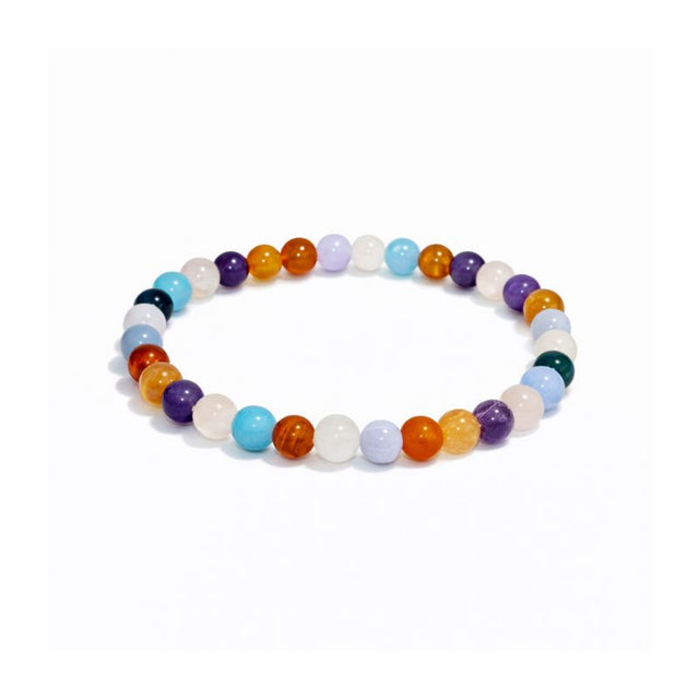 Cada piedra cumple un rol especial: la aguamarina aporta calma emocional y protección, la cornalina está asociada a la fertilidad, la vitalidad y la energía femenina, la piedra solar aporta alegría, energía y optimismo, la amatista protege y entrega tranquilidad emocional, el cuarzo rosado representa el amor, la contención y la energía maternal, la ágata de encaje azul (blue lace) aporta calma, comunicación y tranquilidad emocional, y la piedra luna está tradicionalmente asociada a la fertilidad, la maternidad y los nuevos comienzos. Juntas crean una combinación energética asociada a la fertilidad, la protección, el amor y la nueva vida.