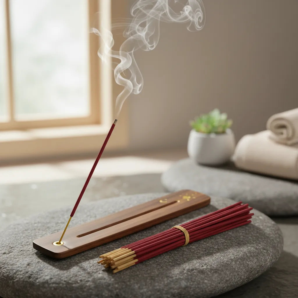 Colocar la varilla en el porta incienso, encender la punta recubierta hasta que aparezca una pequeña llama y dejarla unos segundos. Luego soplar suavemente para que continúe humeando. Usar sobre una superficie resistente al calor, en espacios ventilados y no dejar encendido sin supervisión.